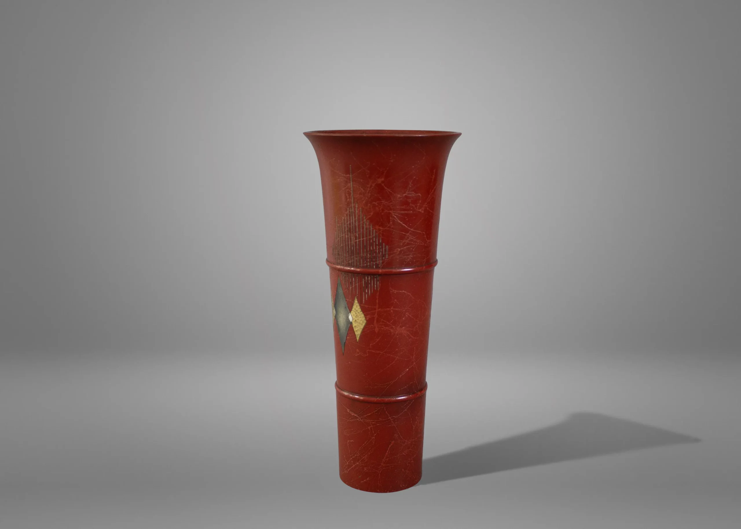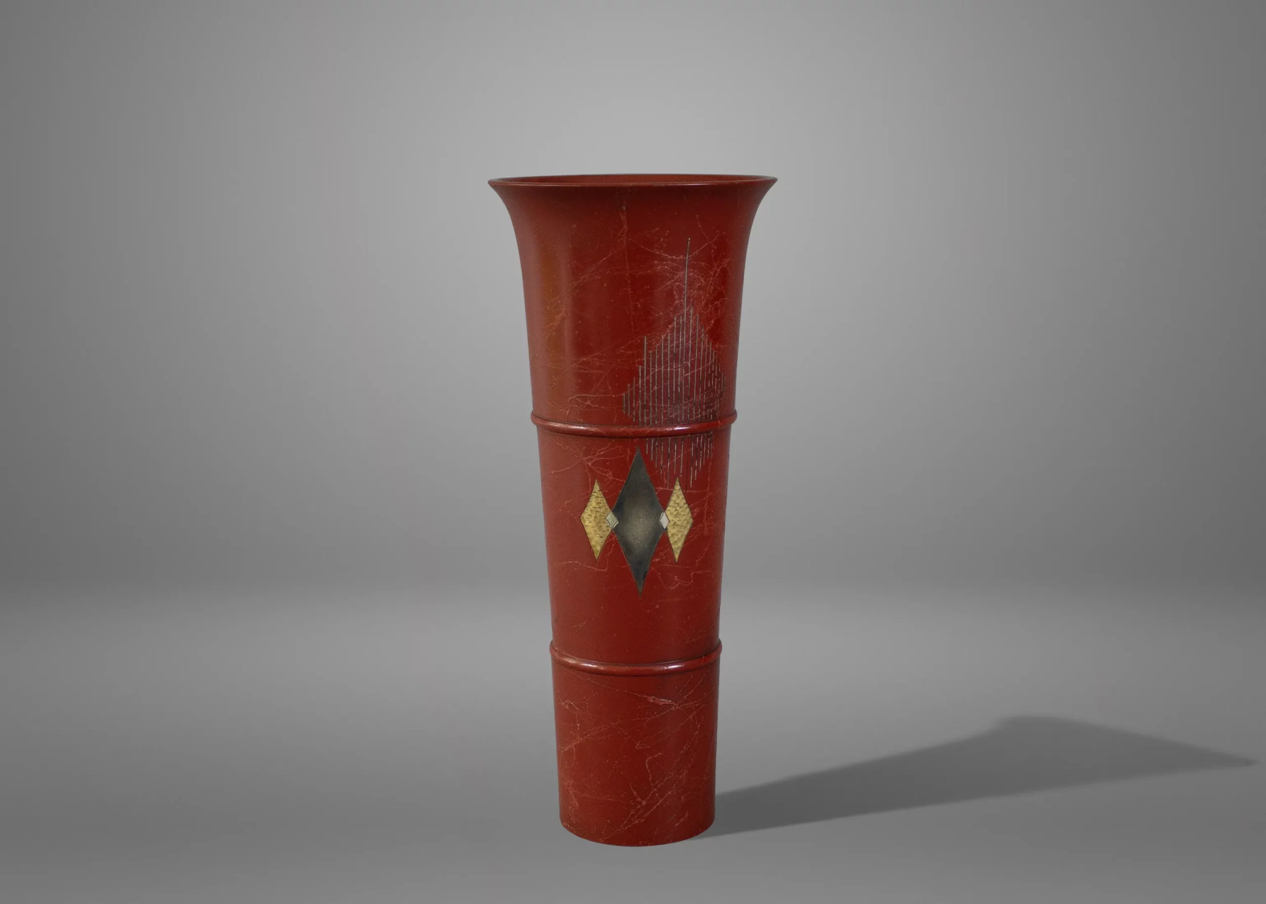 A flared copper vase with red, textured patina, inlaid with silver and gilded copper geometrical motifs