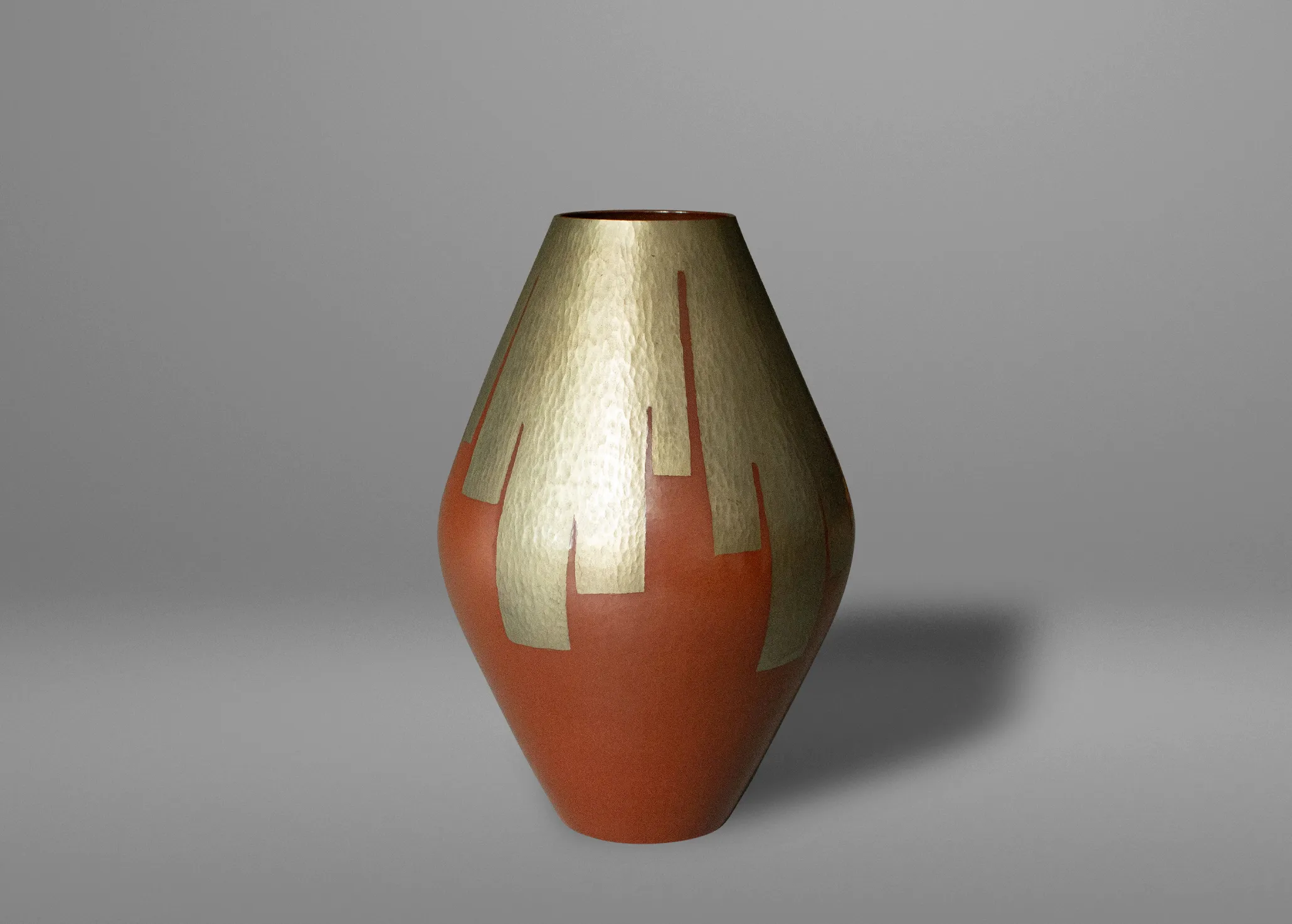 Vase en cuivre martelé à patine rouge et doré à décor de bandes verticales